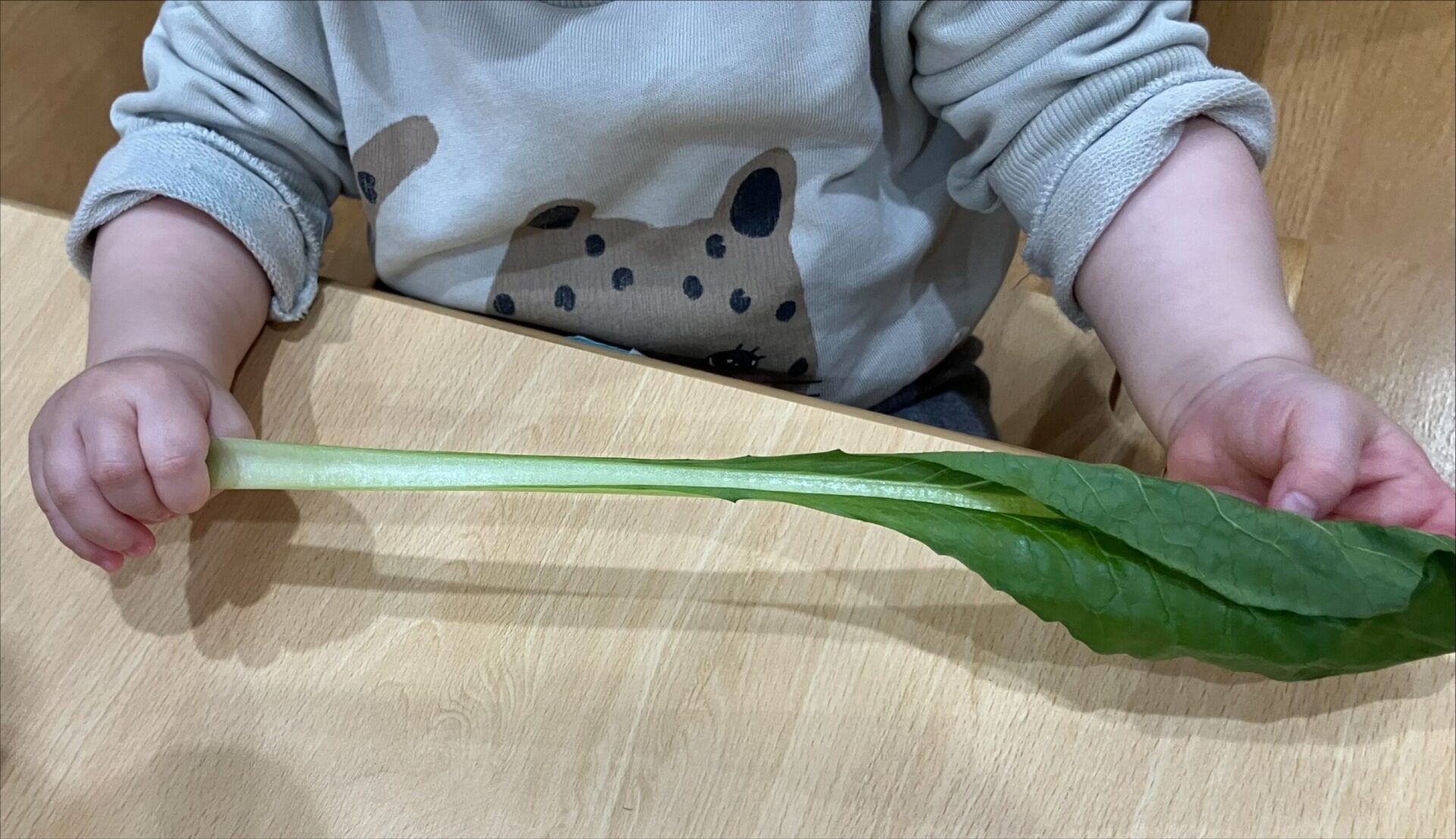 小松菜は旬なこともあり大きくパリッと立派な葉っぱ。「いないいない…ばぁっ!」ニッコニコの笑顔が飛び出します!以前のキャベツの食育と同様、ちぎってちぎって、くまさんに「あ~ん!」みんな食べさせてあげたくてせっせとちぎってくれます。