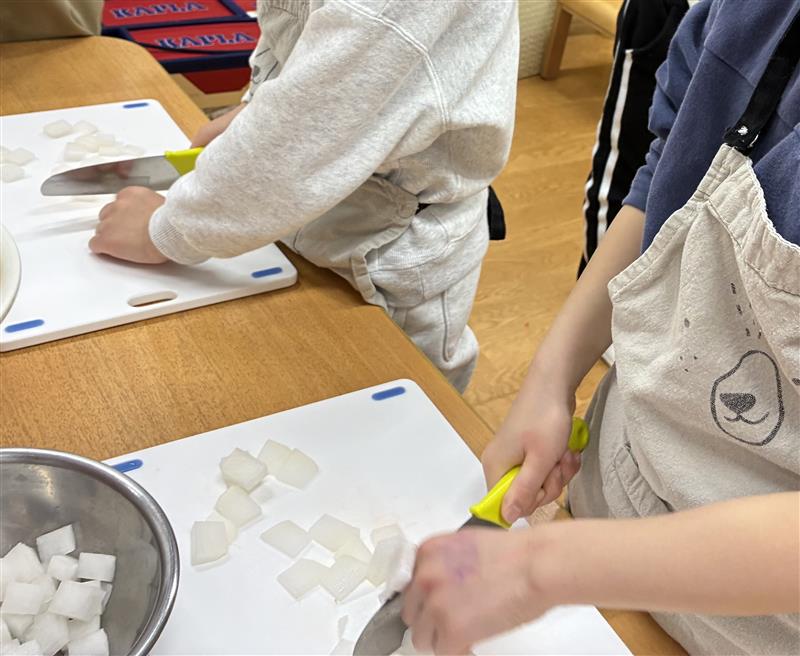 給食の時間に「今日のにんじんと大根はぼくたちが切りました!!!」と言って他のクラスを回ったり、自分たちの給食をみて「このにんじん切ったの誰だろう?」「私だよー!」「大きいから僕じゃない?」と話したり、調理の楽しさを味わうことができました♪