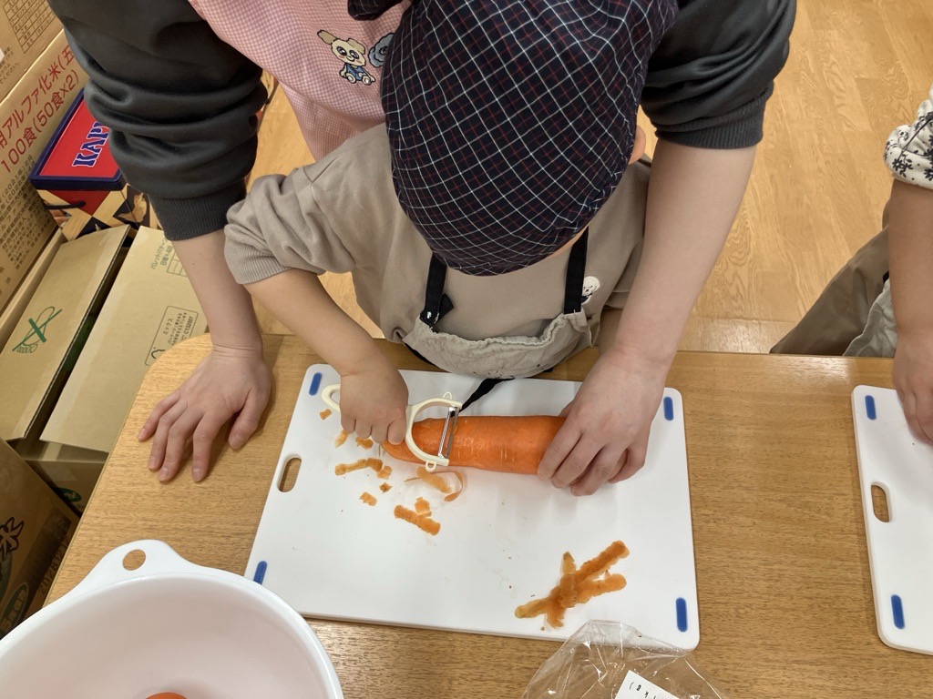 保育者と一緒に人参を押さえながら、みんな真剣な様子でピーラーで皮むきをすることができました。
