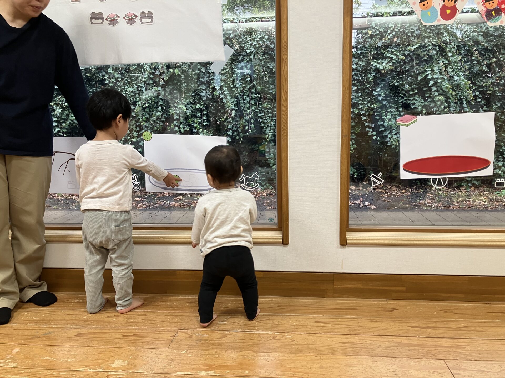 「それはここにはるんだよ」「うん・・・・」2歳クラスのさくら組のお友だちが0歳クラスのかえで組のお友だちに教えてあげています。