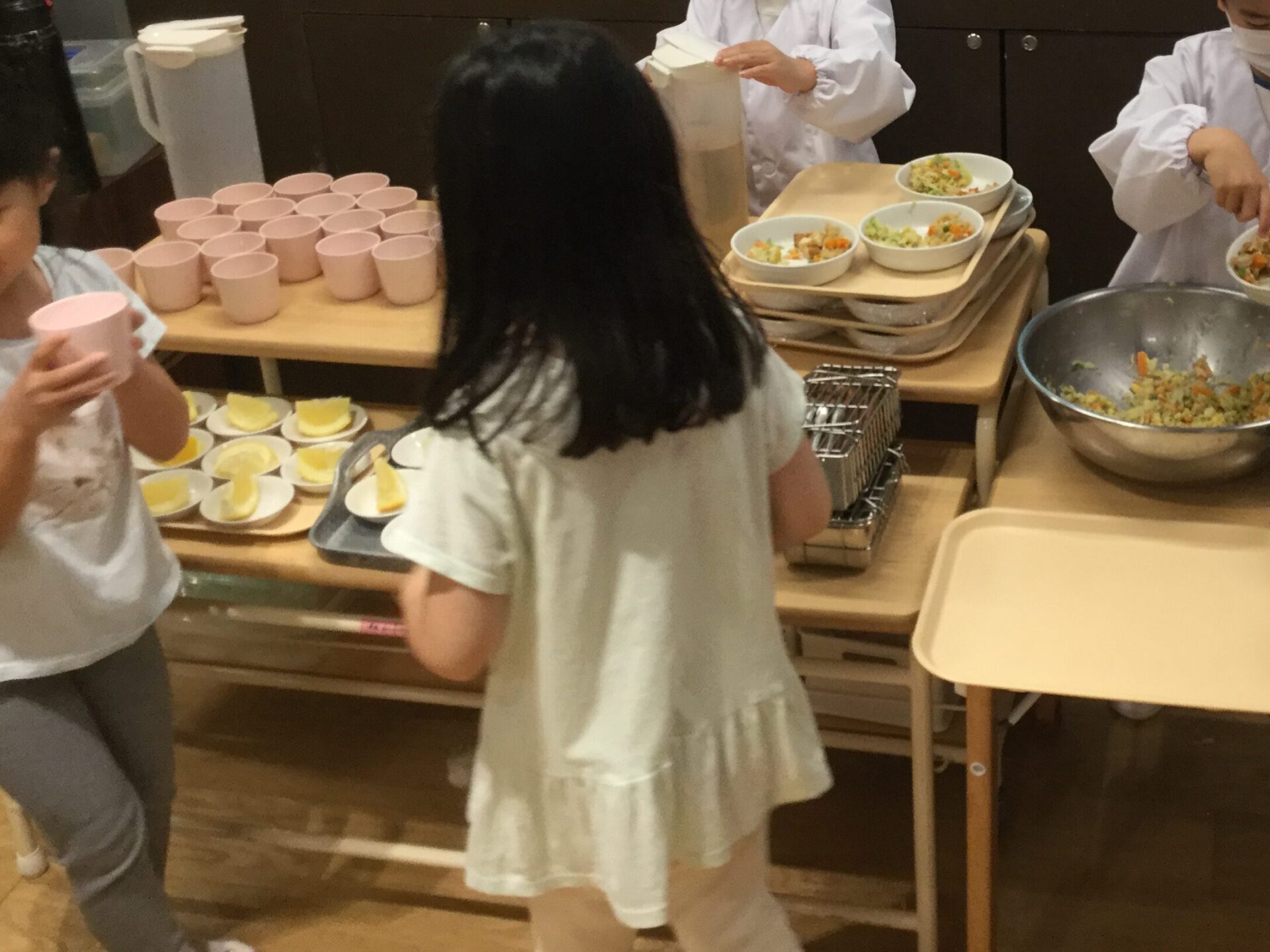 就学前の準備として6月よりらいおんぐみの子どもたちにお給食当番をお願いしています。