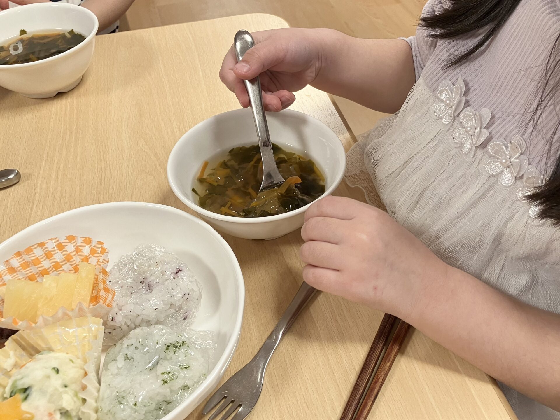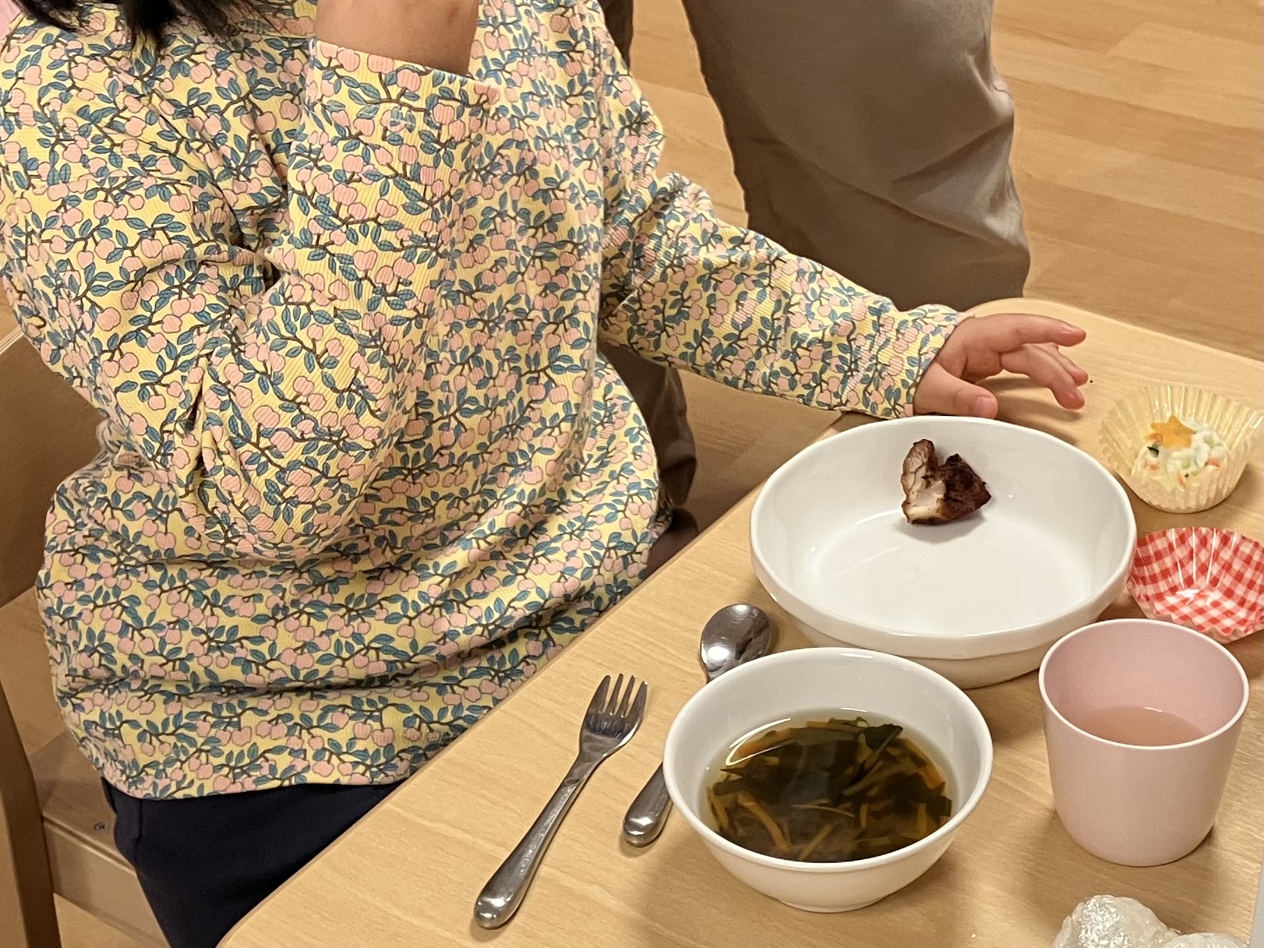 トングを上手に使い、スープも両手でしっかり持って、自分の席まできちんと運べました!