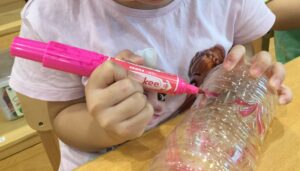 何で作ったらいいか子どもたちに聞くと「ペットボトルで作るのはどう?」「的に絵も描きたいな!」と次々にアイディア出てきました!そこから、的になるような妖怪の絵を描いたり、当たったら何点と分かるように点数を描いたりと進めていき完成♪