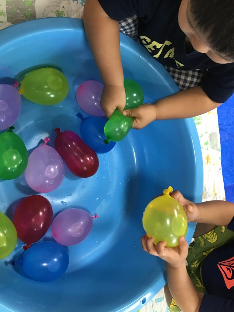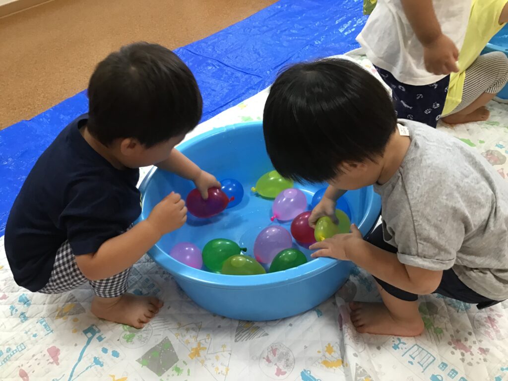 今日は水遊び道具の他に、水風船を用意しました。