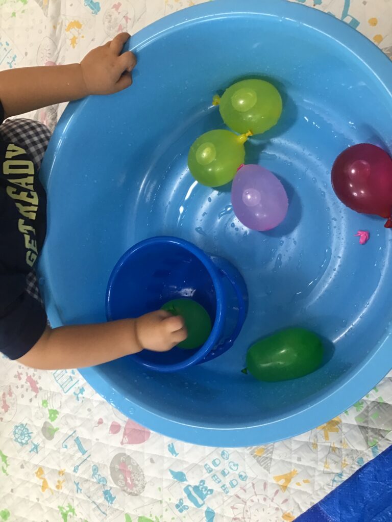 バケツの中へ水風船を集めてみたり、タライからタライへ移し替えます。