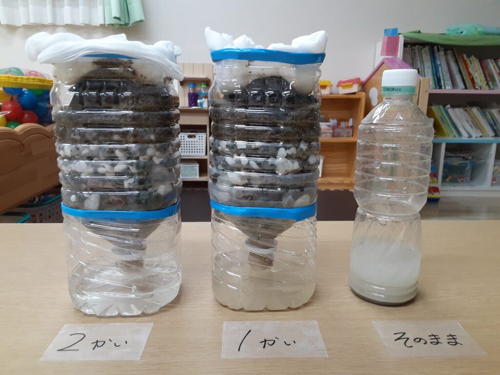 その後、小石や炭などをペットボトルに入れて実験!ろ過された水が出てくると、「ちょっとずつでてきた!」「きれいになってる!」とみんな興味津々でした。