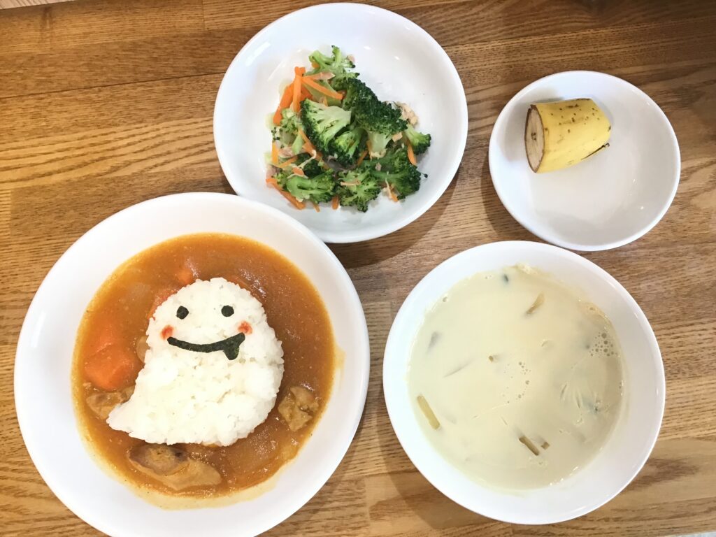 かぼちゃの入ったカレーの上にごはんで作ったおばけをのせました。いたずらが好きそうなおばけですね…♪