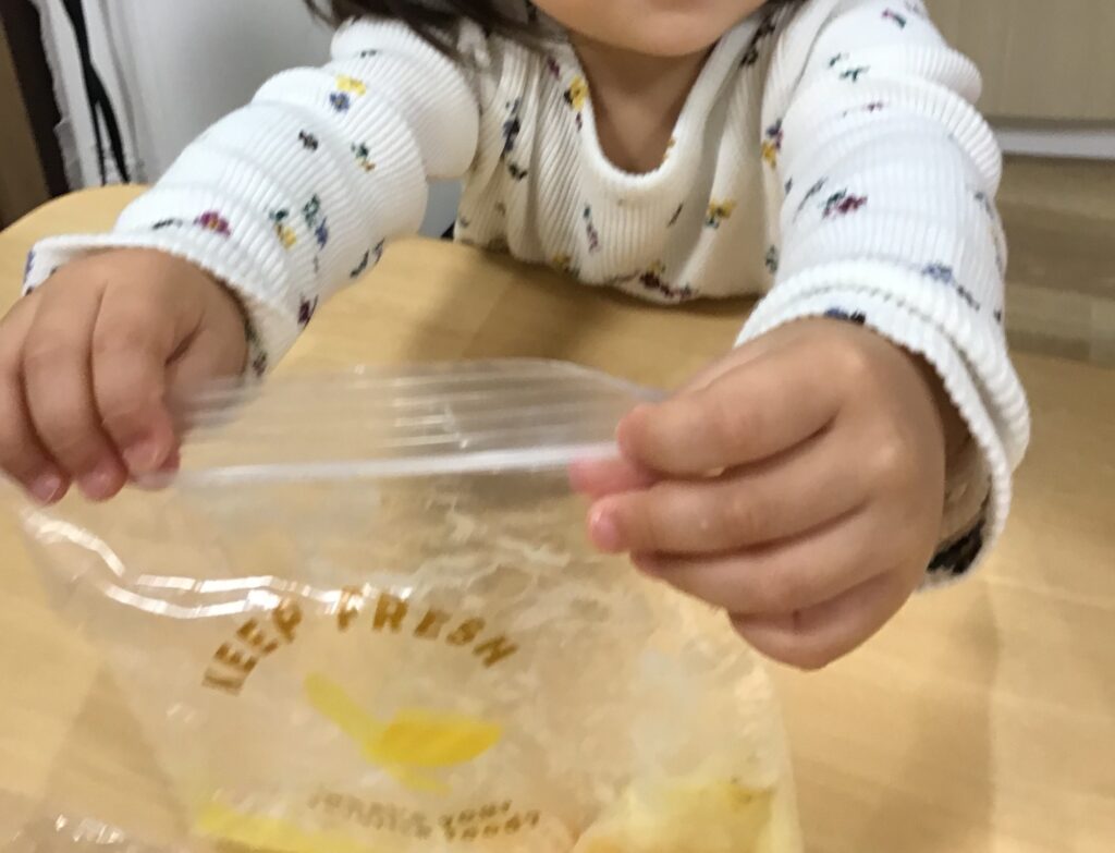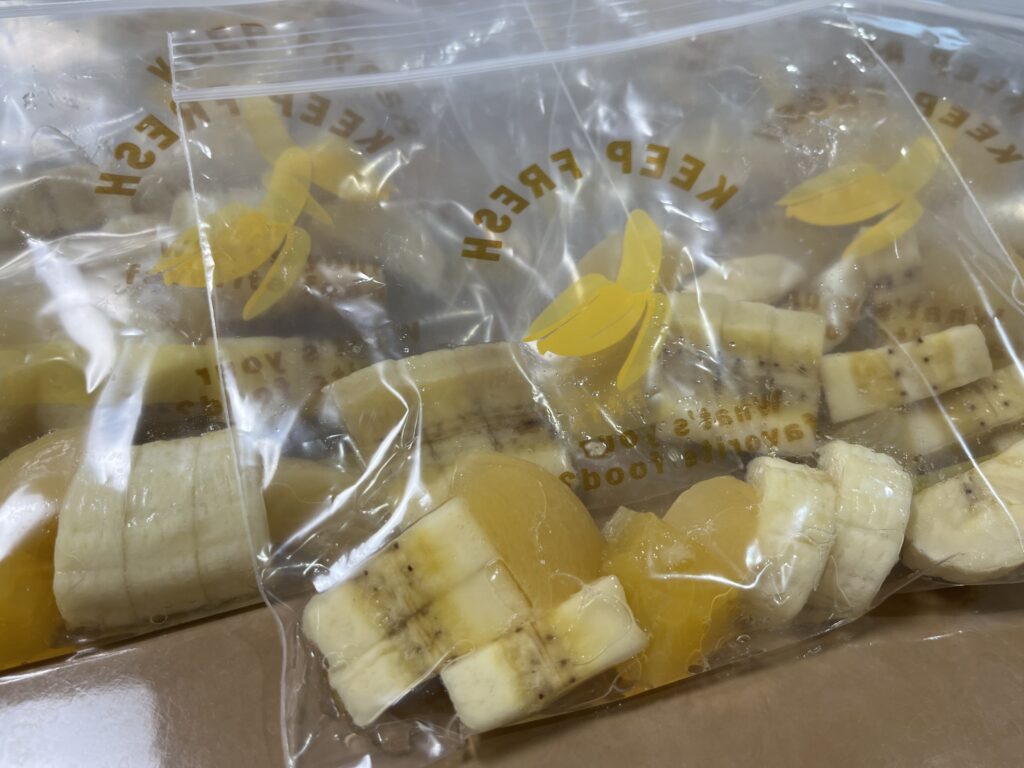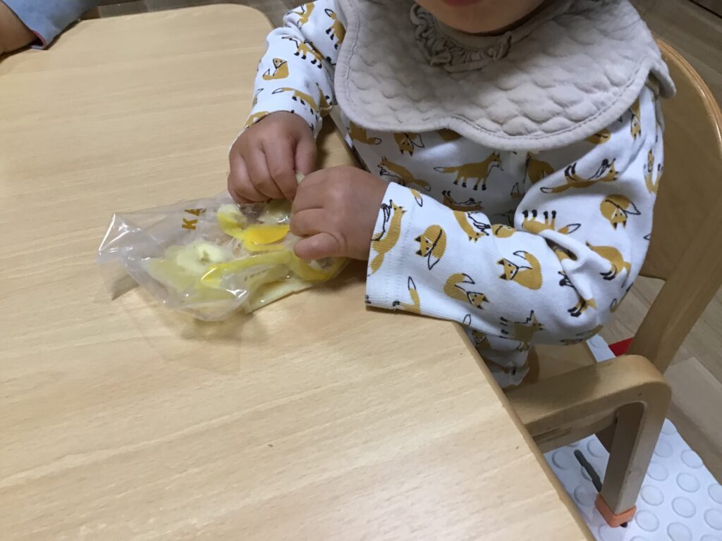 ジップロックに1人分ずつ果物を入れて子どもたちに渡します。