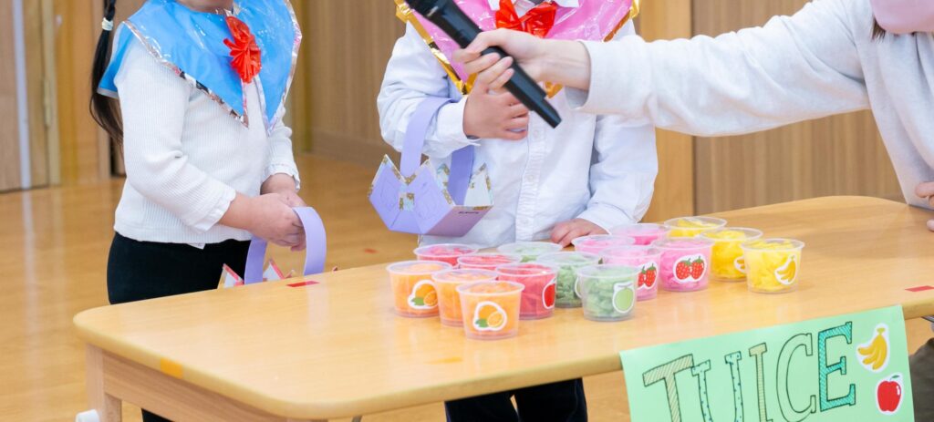 アクテビティ(イングリッシュ)が大好きなぱんだ組さん!発表会では、アメリカのジュース屋さんに出掛るという設定で、「What’s your name?」で自己紹介をしたり、「What do you want?」で欲しいジュースを答えるなどして、得意な英語を披露していましたよ。