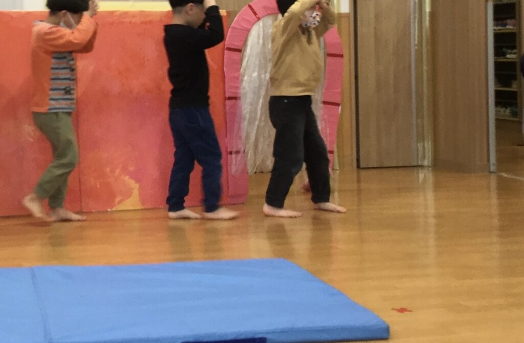 大好きな絵本「へんしんトンネル」を題材にし、それぞれの得意なことを披露したきりん組さん!具合が悪く早退したお友だちは、「そうたい…そうたい…たいそう」で体操選手に変身!わなに引っかかったお友だちは「わな…わな…なわ」でなわとび選手に変身!そして最後は友だちのきみちゃんを探して、「きみ…きみ…みき…ミッキー」に変身し、ジャンボリーミッキーを踊ったりと、堂々とした発表になりました✨