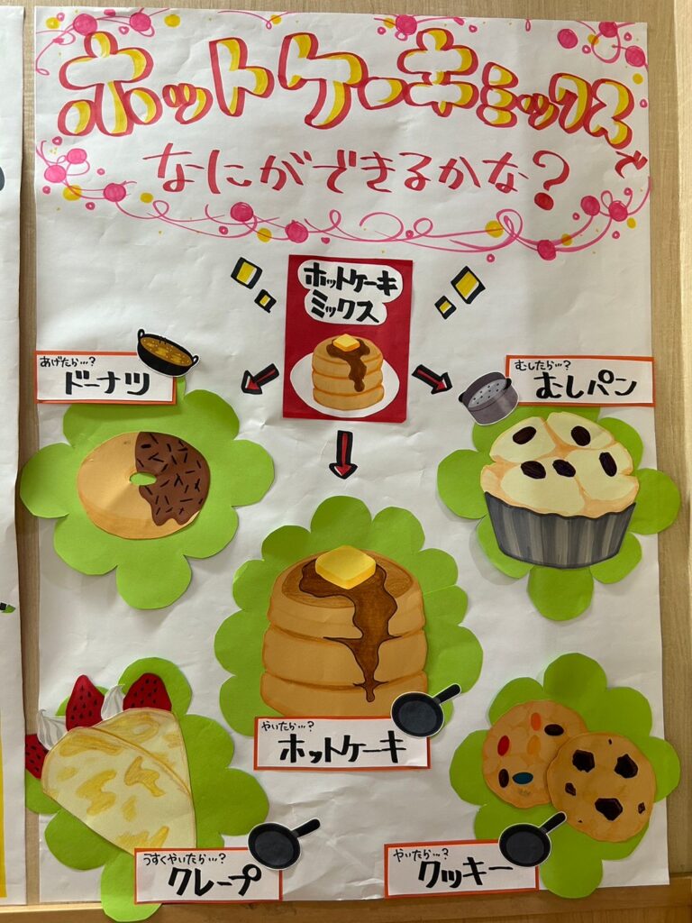その他にも、「ホットケーキミックスでなにができるかな?」を掲示しました。絵本の中でホットケーキを焼いている様子からホットケーキ以外にもすきなおやつはどんな風にできてるかな?と想像してみたり、このおやつも好き!!と考えてみたりとこどもたちは廊下を通ると興味津々な様子で見ていました。