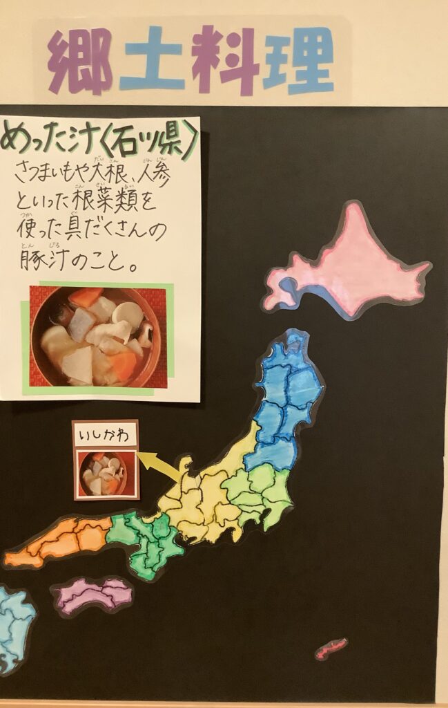 郷土料理も給食室横に掲示して、保護者の方に見てもらえるようにしました。