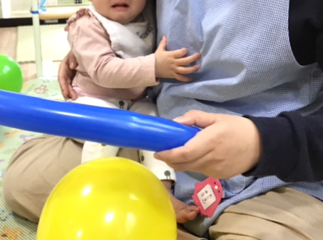 初めて見る風船に戸惑い、不安な気持ちを抱いている子は、担任がそっと寄り添い、膝の上や保育士の横で風船に少しずつ触れていきます。