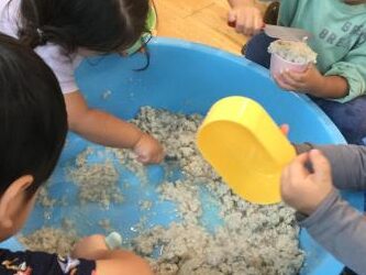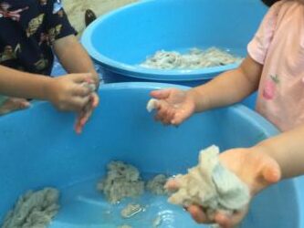 先週遊んだトイレットペーパーに水を含ませて感触遊びのコーナーを作りました。