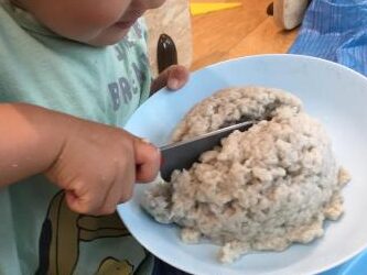 完成したご飯を切り分けるのも楽しかったようです。どんどん見立て遊びがリアルになり、大人の言動をよく見ているんだなと感じますね。