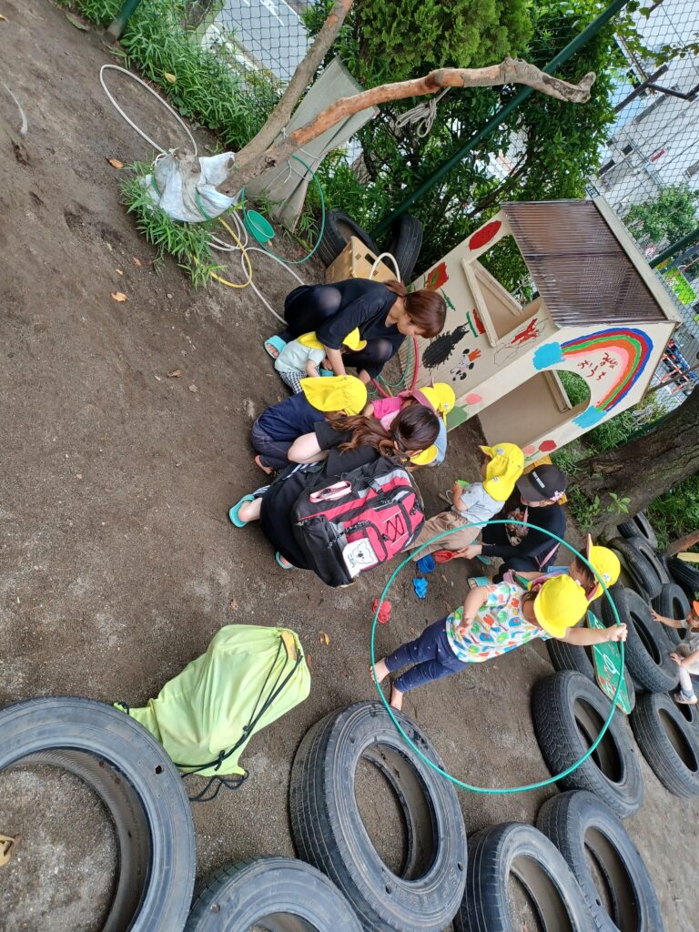 靴と靴下を脱いで園庭へ。まるで遊園地!お山で遊んでいる子、お砂場でごっこ遊びをしている子、三輪車、フラフープ、大きな木にロープが結んであってブランコの様に遊んでいる子、お花摘み…。子ども達の笑顔が園庭いっぱいに広がっている…!先生の表情がキラキラ輝きました。