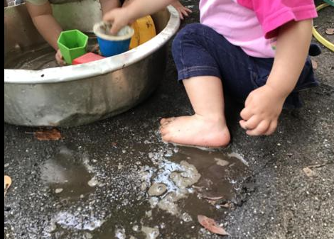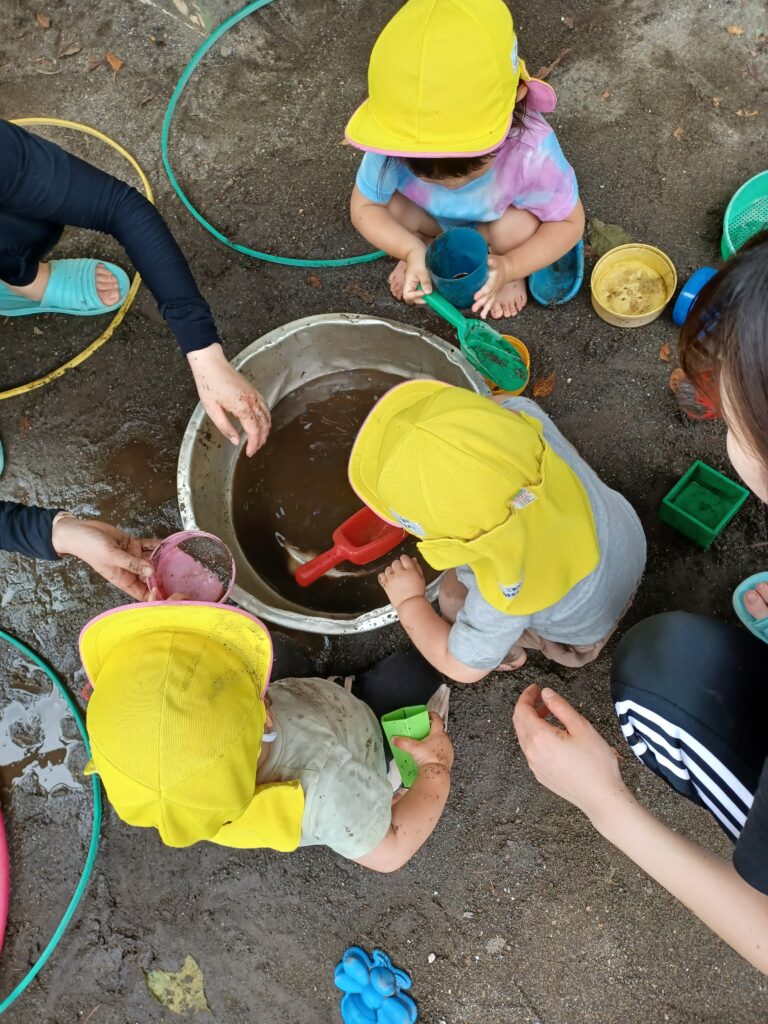 目黒区では、地域全体で子どもの最善の利益を守る事が出来る保育環境を整える為、公私立園長会を年数回開催しています。5月の園長会では、都立大学にある近隣の保育園の園長が集まって「交流できる機会」について話し合いました。広い園庭のある区立第三碑文谷保育園の園長先生から「是非、遊びにいらして下さい」とお声掛けを頂きました。職員に伝えると普段、出来ない「どろんこ遊び」を思いっきり楽しんでもらいたい!是非遊びに行きたい!という声が上がりました。「どうぞ!楽しんで下さいね」快諾して頂き、先日、1歳児クラスの子ども達と職員と一緒に訪問しました。