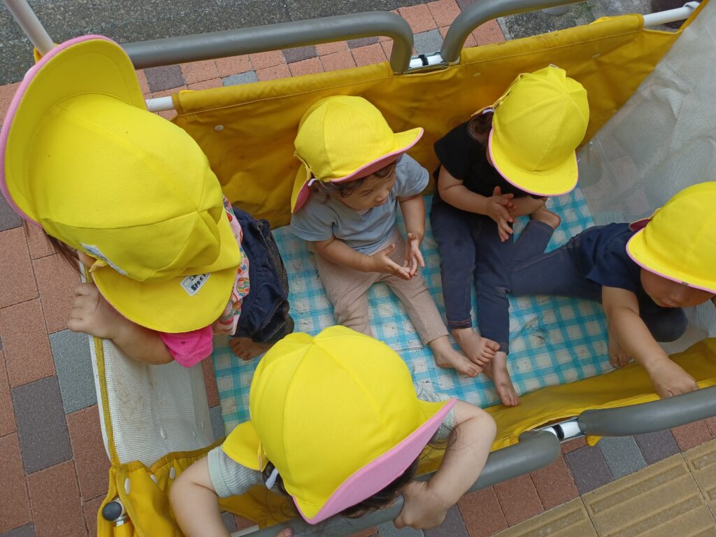 目黒通りを横断する為、散歩車2台でビュ~ンと第三碑文谷まで。。歌を歌いながら楽しく行きました。季節柄、きれいに咲いている紫陽花を見つけるとダイナミックにタッチ!子どもらしさがとても可愛らしく先生達の笑顔の花も満開です。保育園に着くと園長先生が笑顔で迎えて下さいました。「散歩車はこちらに置いて下さいね。他園の園児さんもいらっしゃっていますよ。」