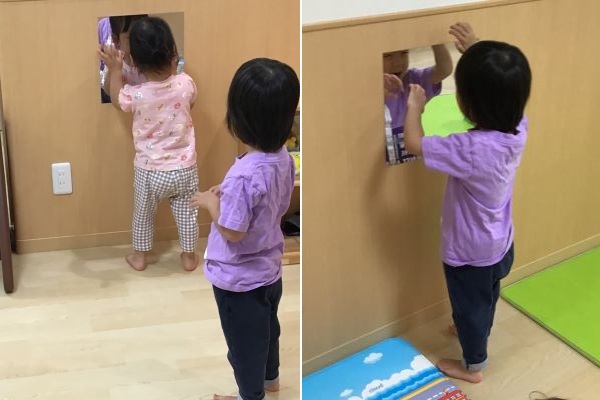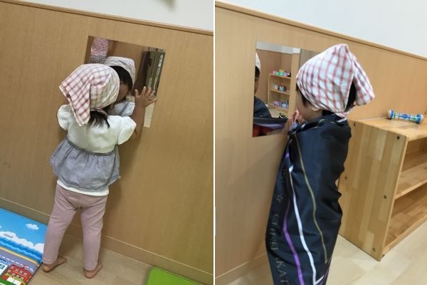 保育士が遊びスペースに割れない鏡を設置しました。