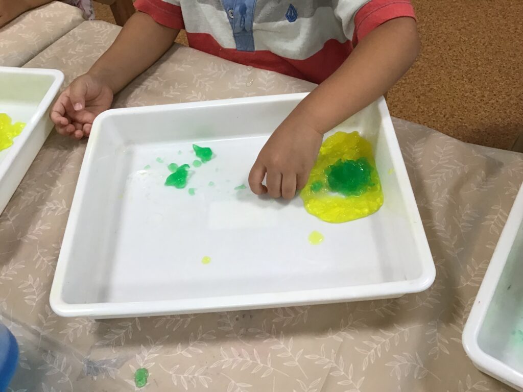 寒天遊びでは、寒天独特の感触を楽しみながら、握ったり、潰したりと指先の発達を促したり、色の種類を増やすことで、混ぜてみたらどんな色になるかな?と子どもの想像力や思考力を育むことに繋がります。