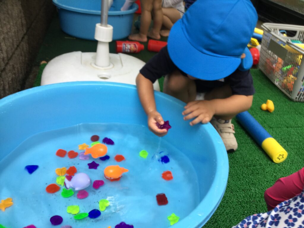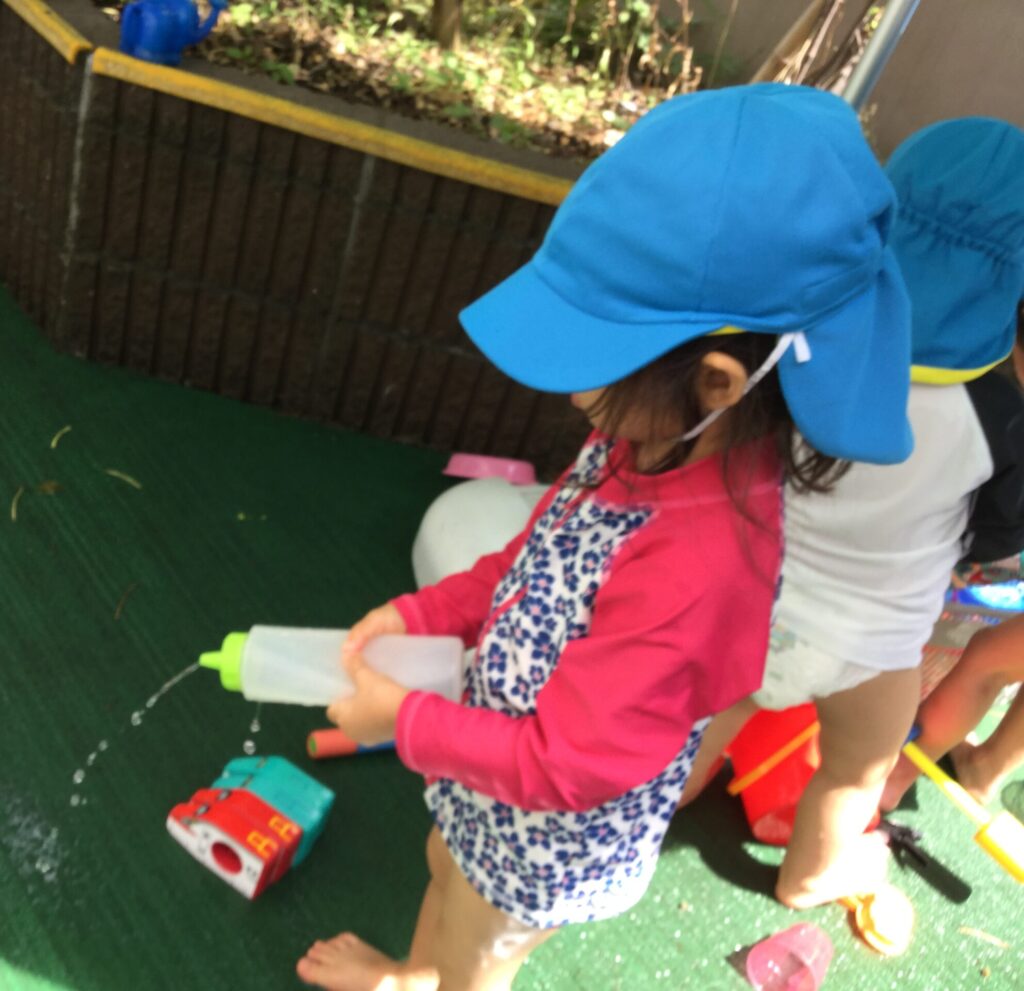 しかし、水遊びを繰り返していくうちに子ども達の遊びに変化が出てきました。ジョウロでテラスに植えてある植物や虫に暑いからと、水をあげてみたり水鉄砲を使って遠くまで飛ばしたりと遊びの幅が広がっていきましたよ。室内遊びで使用している水に強いおもちゃも取り入れて水遊びを思い切り楽しんでいます♪