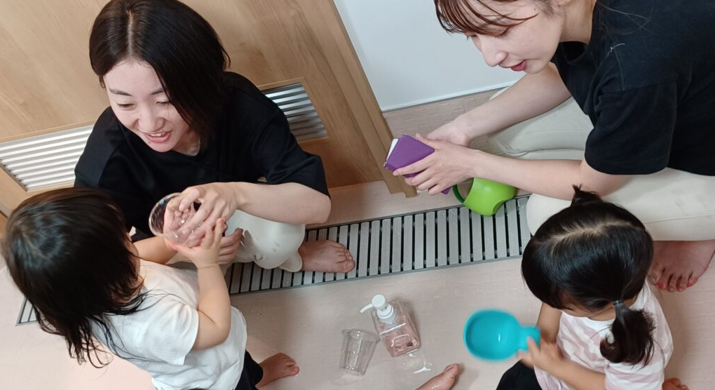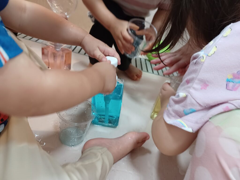 保育士が用意したポンプ式の容器に食紅を入れると、水の色が変わり素敵な色に染まりました。