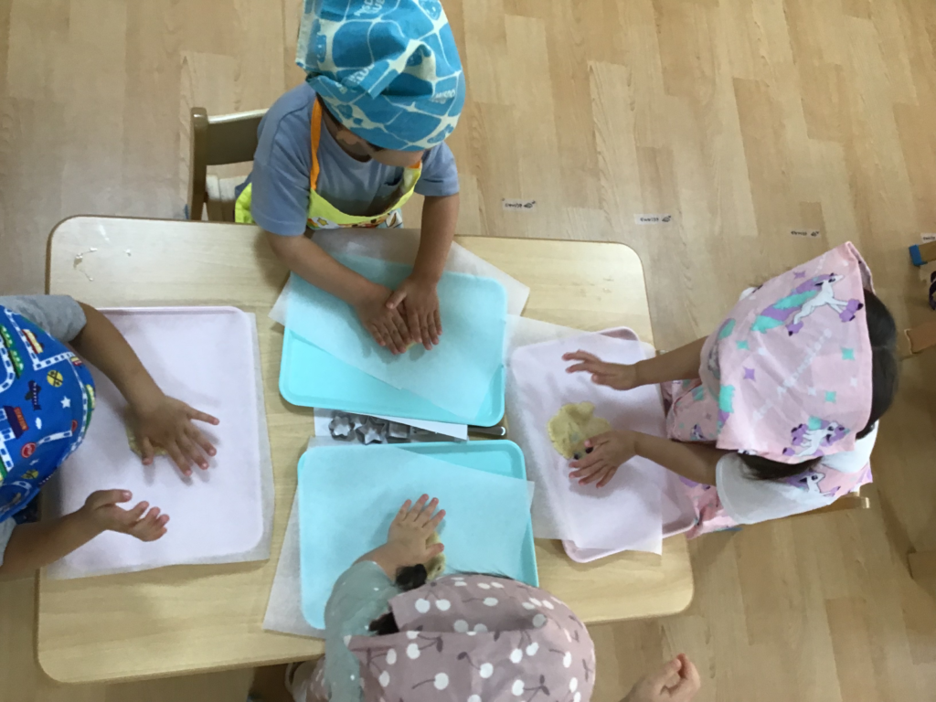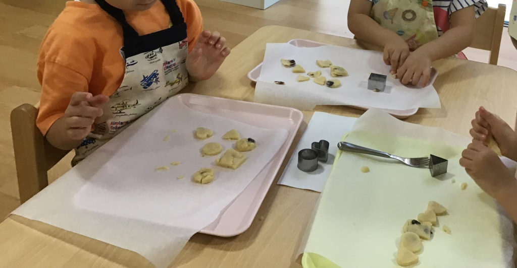 子どもたちには、生地を伸ばして型抜きをやってもらいます。