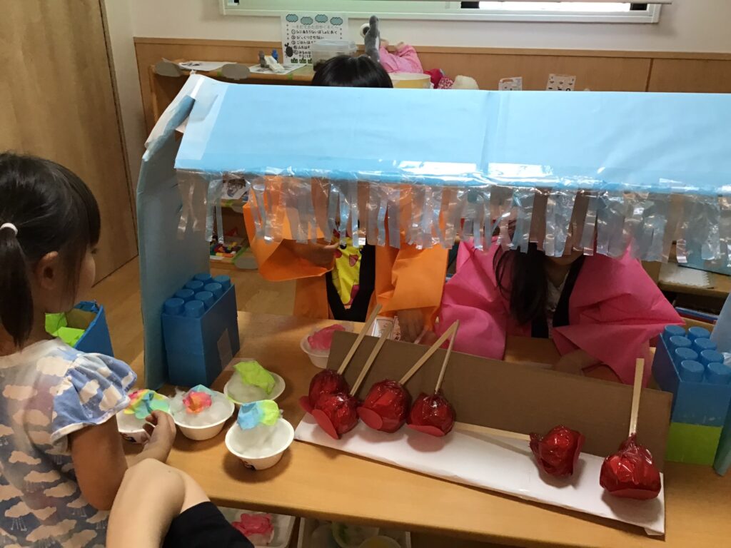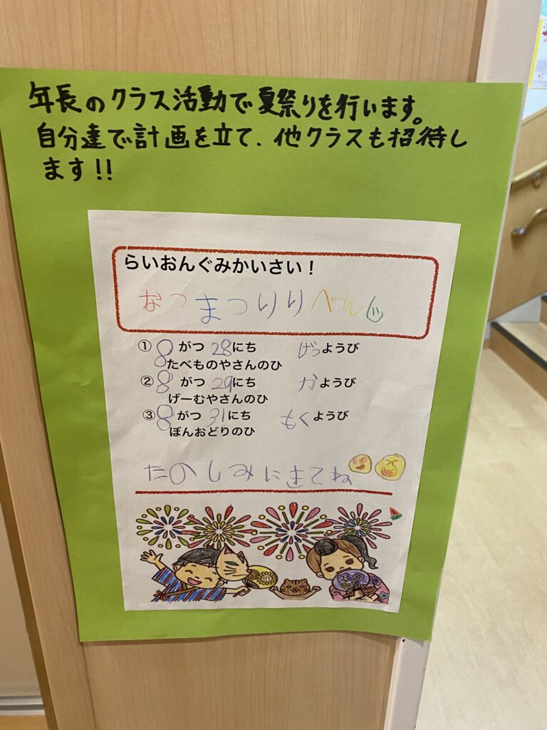 7月に開催した園内の夏祭り当日は残念ながら欠席者が多く、園行事に参加出来なかった子もいましたが別日にリベンジ出来たことで、より子ども達の思い出に残るいいイベントになったと思います!
