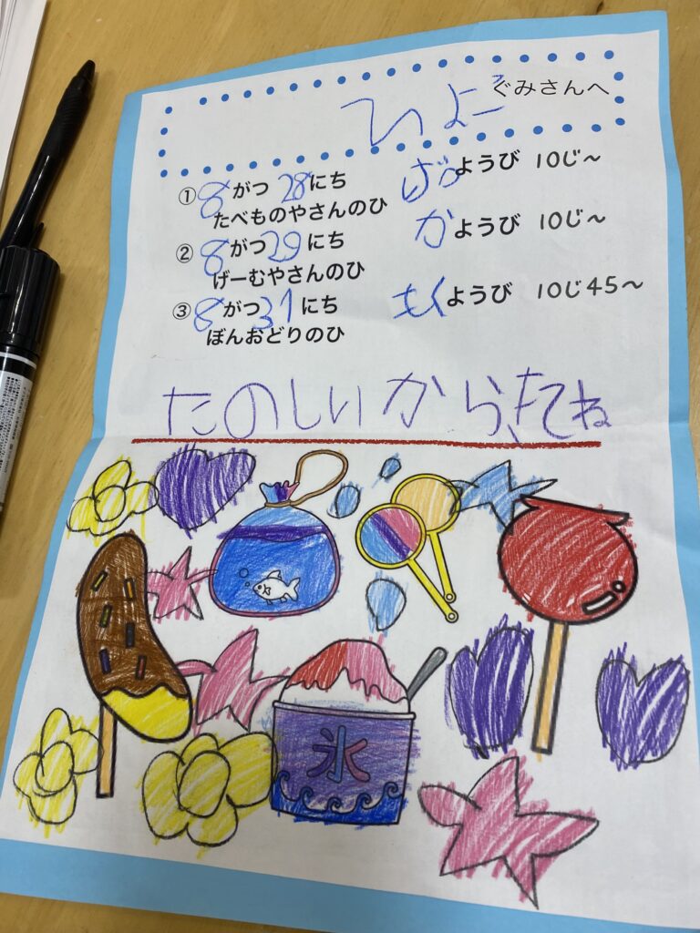 らいおん組の夏祭りに、沢山のお客さんが遊びに来れるように招待状とポスターを作成中…☆
