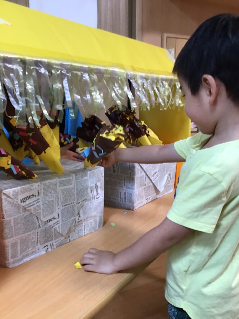 「かき氷は何味にする?」「何の材料で作ろうか?」と細かく決めながら子ども達が楽しそうに