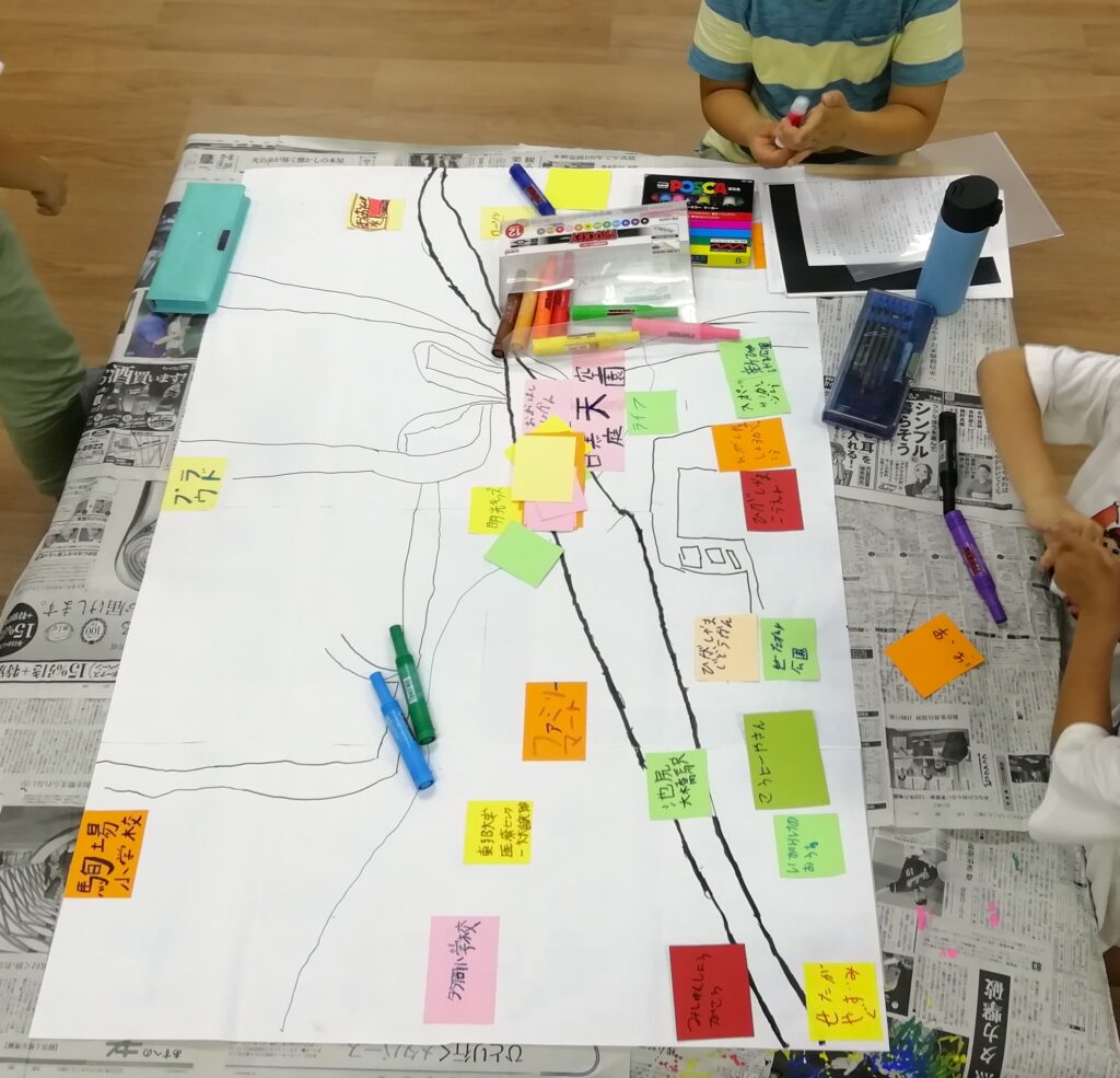 さらに、通う小学校の周辺にある公園、お店などを書き出し、小学校ごとにみんなで紹介し合いました。