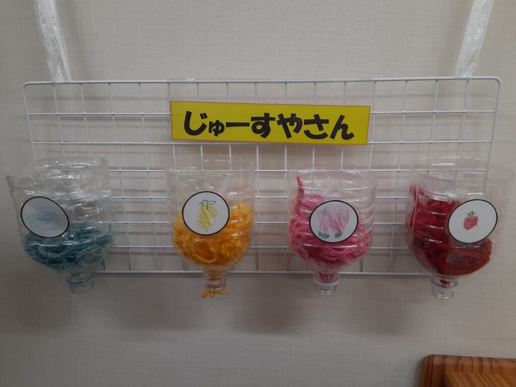 ジュース屋も作ろうと意見が出たので、ジュースの味は子ども達と相談し、イラストを描いてもらいました。ピンクは「桃かな」赤は「イチゴ味」など相談して決めてくれました。