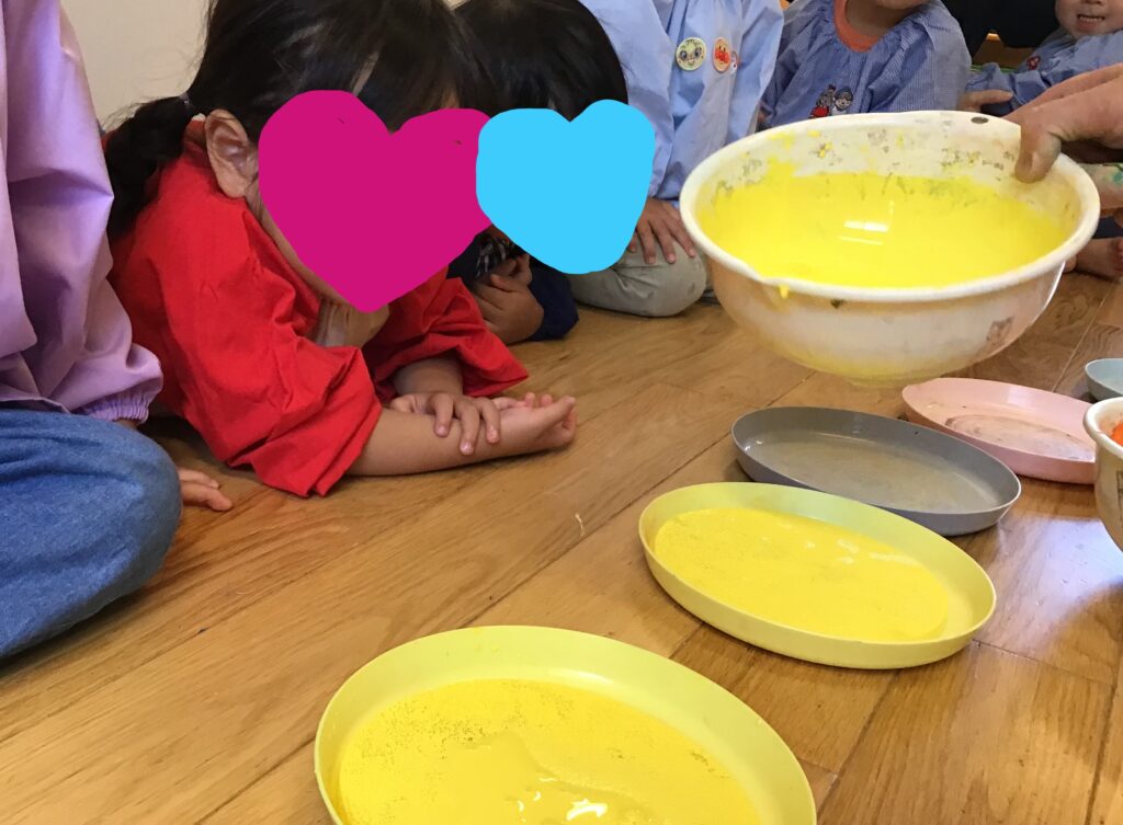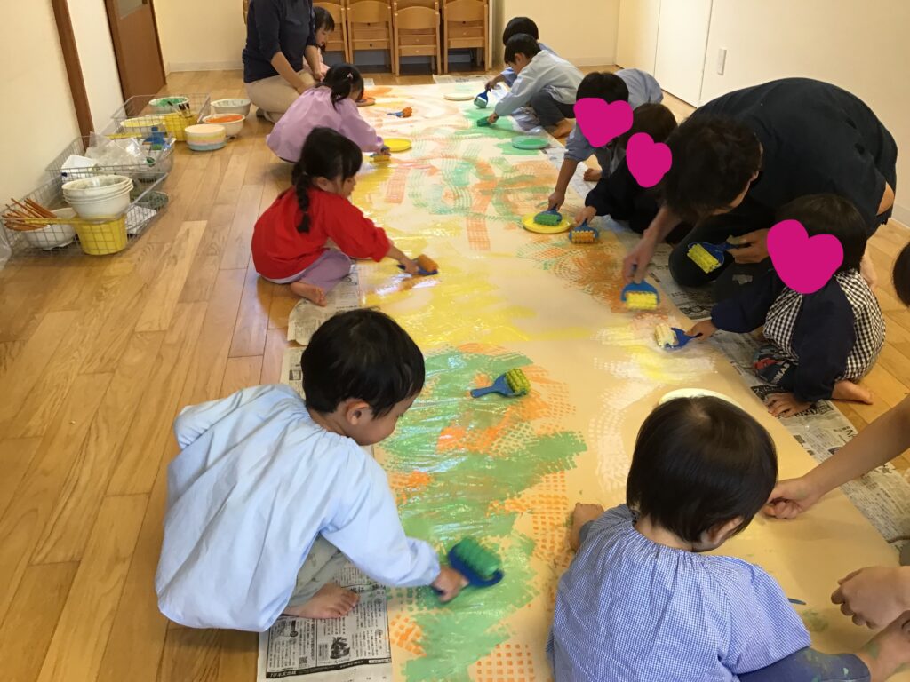 アートの時間に、乳児クラスが絵の具をつかって素敵な作品をつくりました。