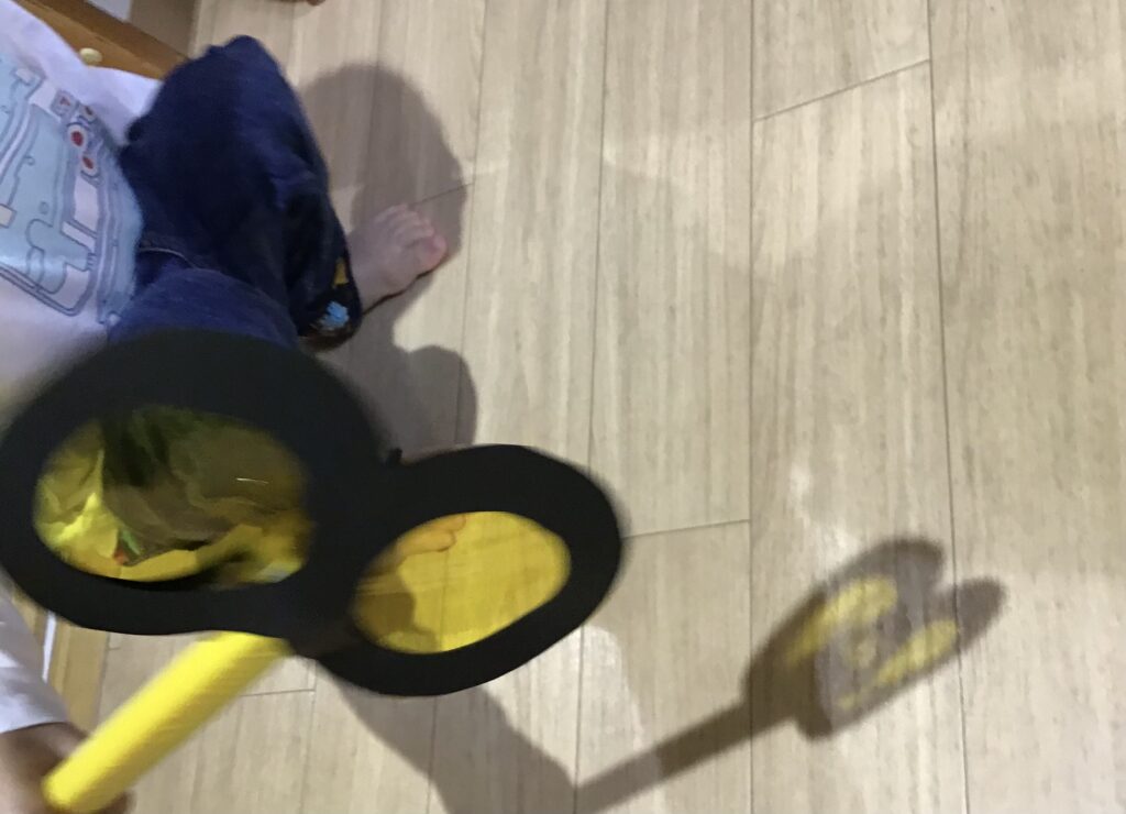 メガネの縁に貼ってある両面テープを剥がします。両面テープを剥がすことに少し苦戦していましたが“自分で”の気持ちが強く何でも挑戦する姿があるので保育者は見守ります。苦戦していた子も自分で剥がすことができると『せんせいできた〜』と嬉しそうな表情を浮かべていました。