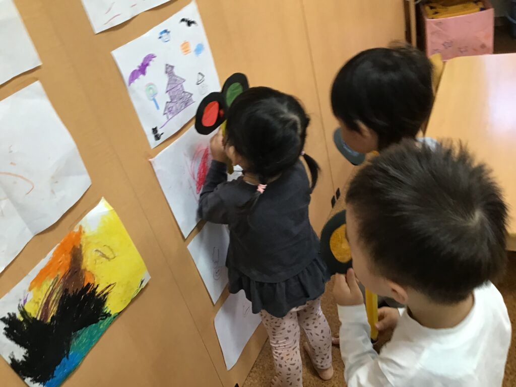 部屋の色が違うことが面白く、様々な物を観察しては保育者に「せんせいこれきいろ!」「これはみどり!」と楽しんでいました。
