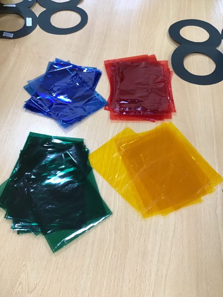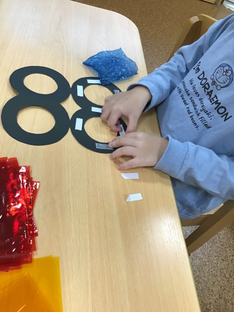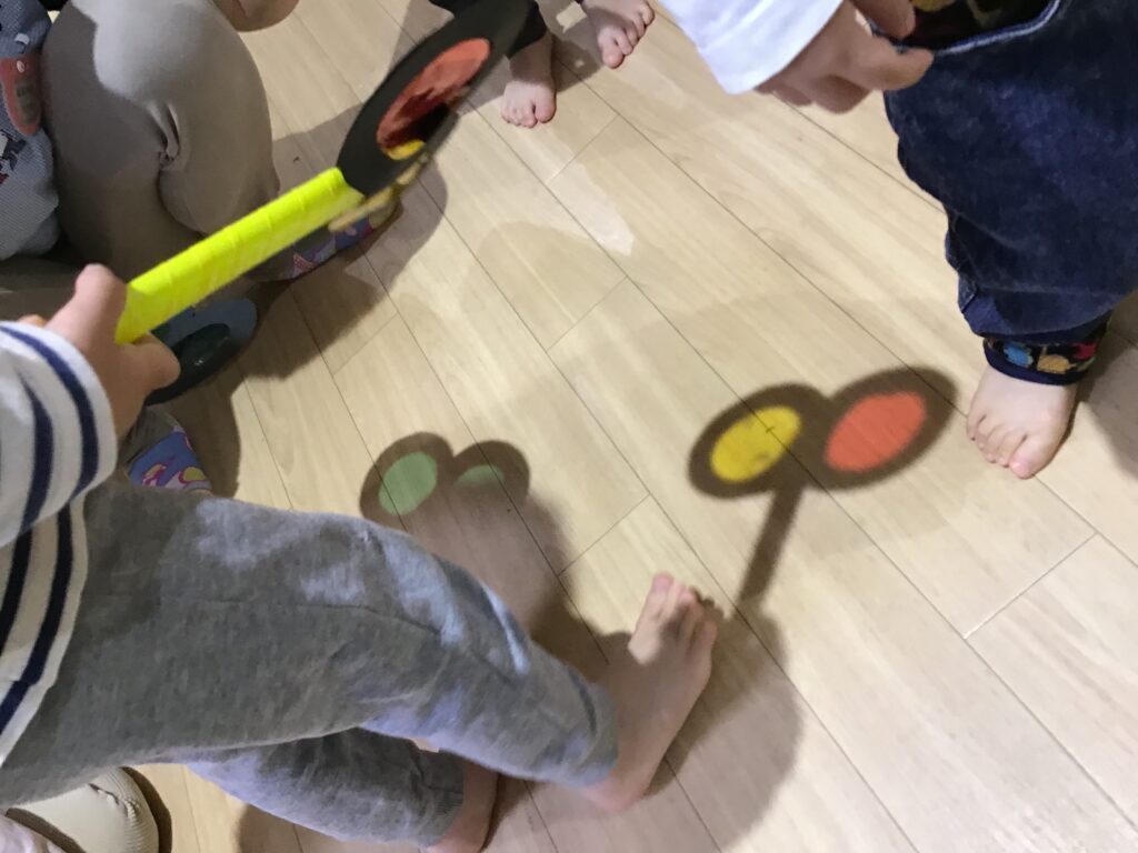 電気が消えた部屋に入ると「あれ?ない!」と床にあったセロハンの色が消えてしまった事に不思議そうな表情を浮かべたり、「なんでなくなっちゃったのかな?」と子どもたちなりに考え「くらいからなくなったんだよ!」と子どもたち同士で話す姿がありました。