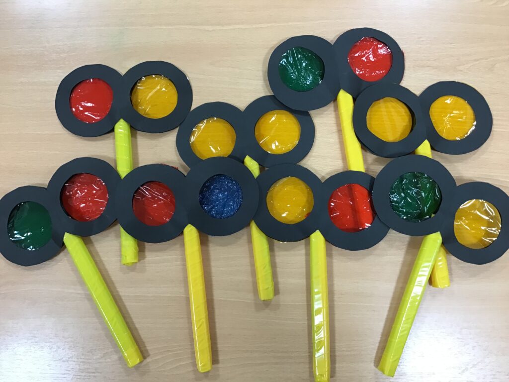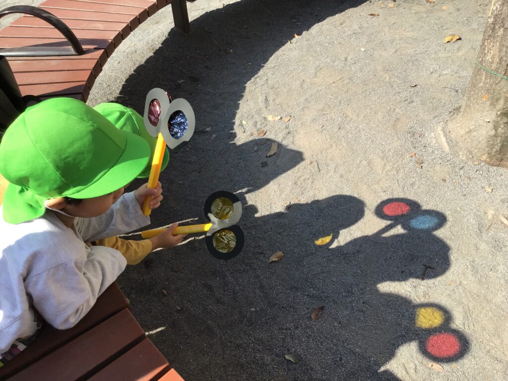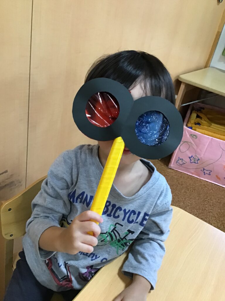 うさぎ組の子どもたちは自分たちで色を決めた”とんぼのめがね”を持って探索を楽しみました!