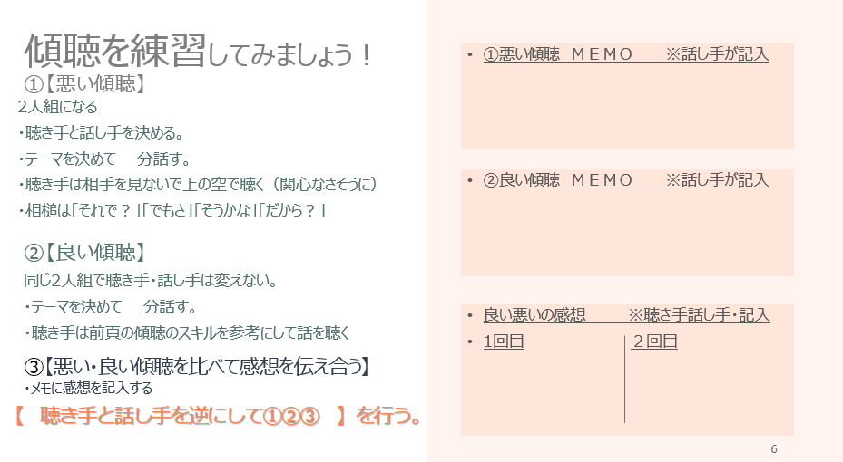 傾聴の効果とスキルを学んだ後、2人組に分かれて良い傾聴・悪い傾聴を実践し、感想を伝え合いました。実践することで話を聴く側の態度が大切であることを学び、皆さんの傾聴力はランクアップしたことと思います。