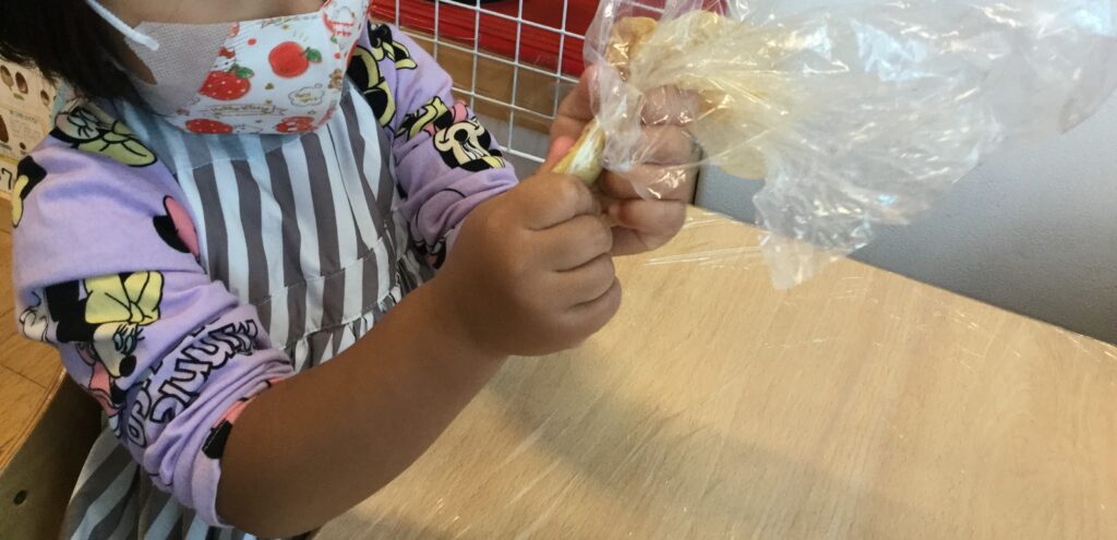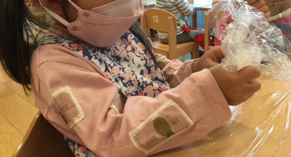 袋に入ったふかしたさつまいもを、もみもみしたり指でぎゅうっとつぶしてみたりとみんなさつまいもの感触を楽しみながら上手につぶしていました!