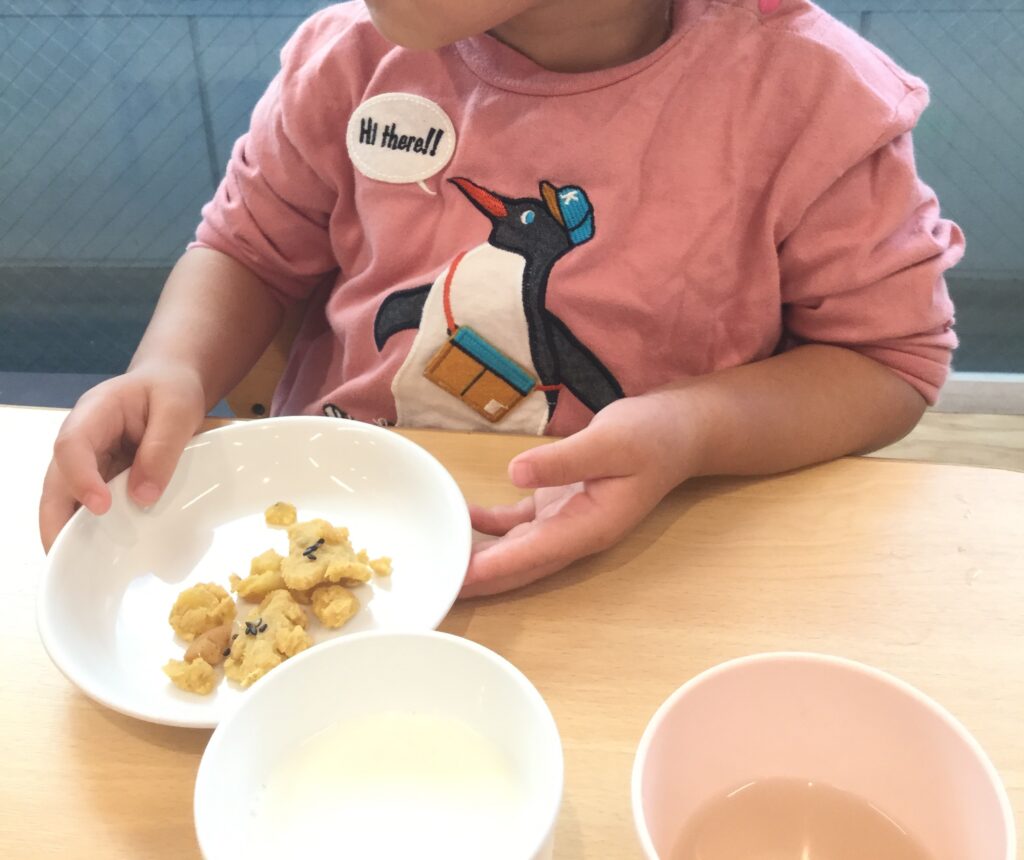 次々に入っていく材料を見て「きな粉いい匂いする!」「茶色いお砂糖だ!」などと興味深々な子どもたち。袋をもんでいくうちに、「色が変わった!」と様子まで伝えてくれました!