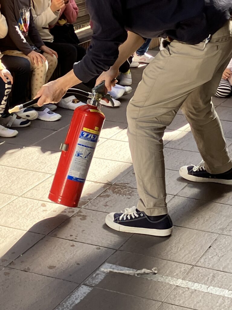 避難訓練の後は水消火器を使用し、保育者が消火訓練を行いました。