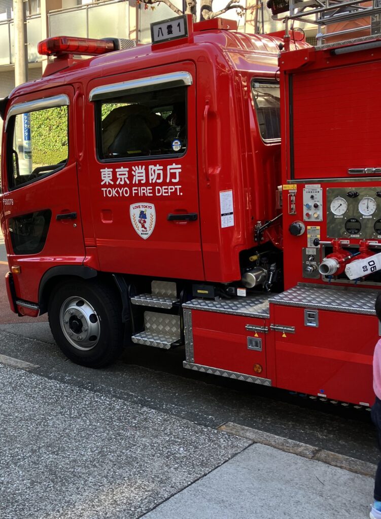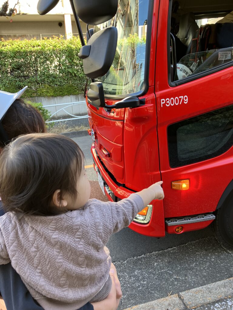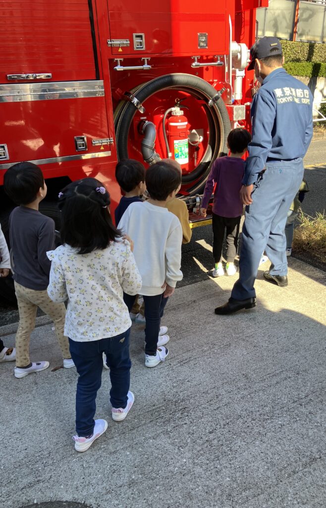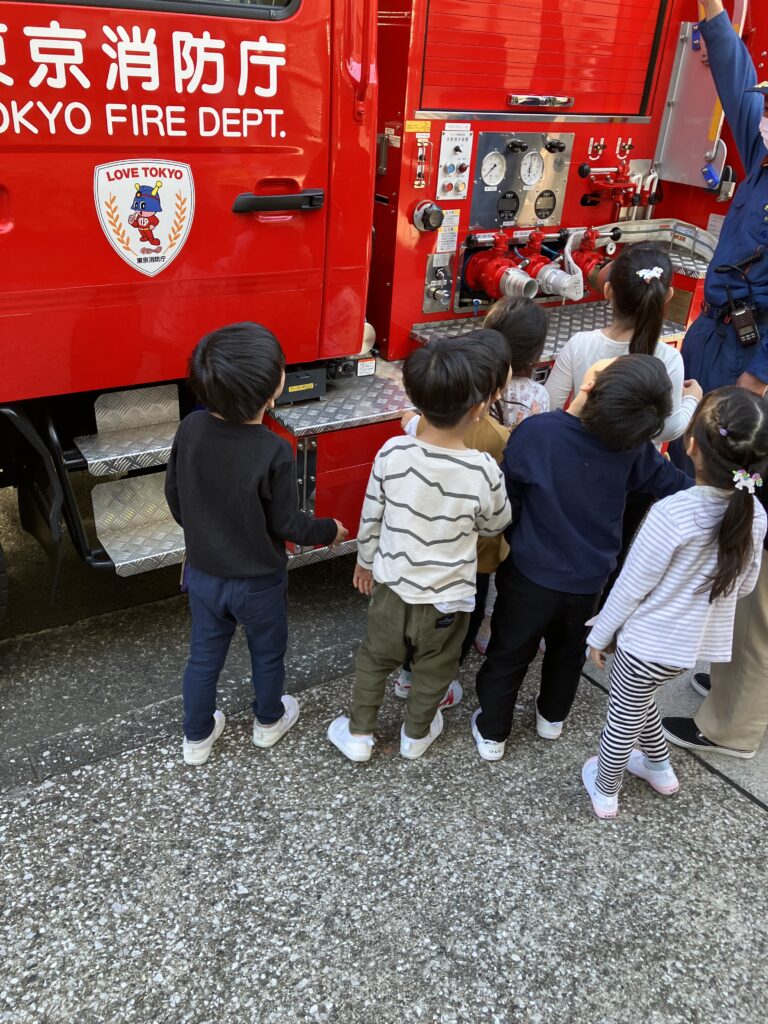 当日消防車が保育園にやってきて、子どもたちは大喜びでした。