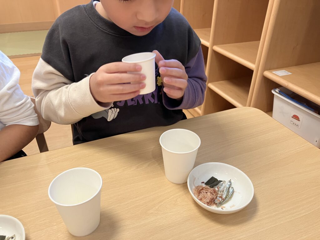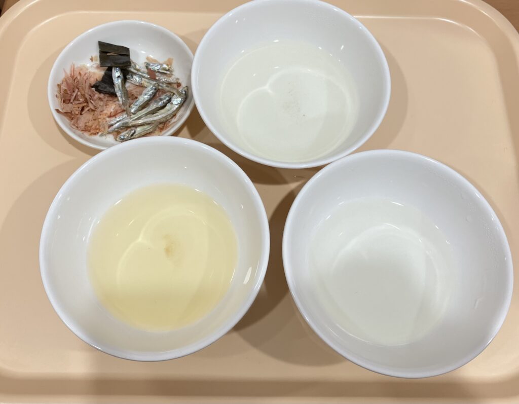 そんな和食の日に幼児クラスで【だしの飲み比べ】の食育活動を行いました。