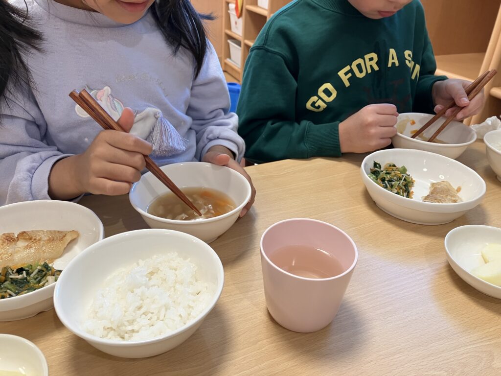 その日の給食は和食を提供し、「今日のおみそ汁はかつおと昆布かな~?」と、だしを感じながら食べる子どもたちでした♪