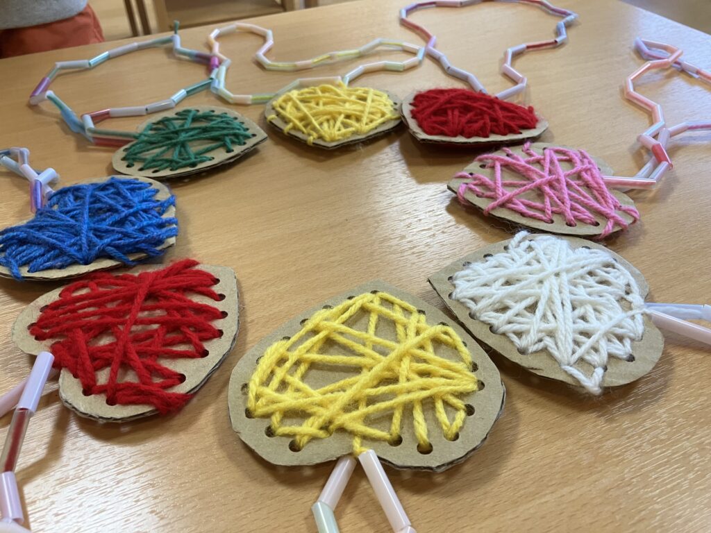 黙々と穴から穴へと紐を通して素敵なプレゼントが出来上がりました!