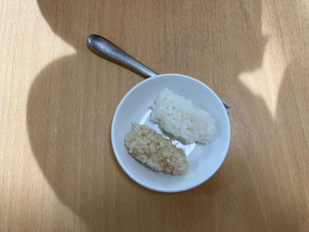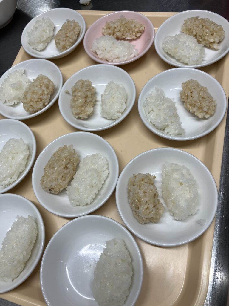 稲穂から玄米へ、玄米から白米へと変化することを学んだ子どもたち。今回は実際に炊き立ての玄米と白米の食べ比べをしてみました。ほとんどの子たちが食べなれない玄米ですが「おいしい~♪」「玄米の方が少しかたいかな」「どっちもおいしい!」とお米本来のうまみを感じつつも玄米と白米の違いを発見した様子の子どもたちです。