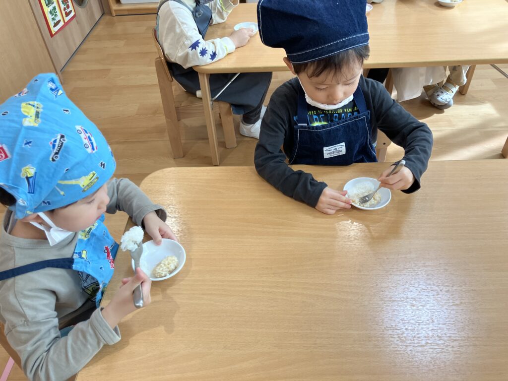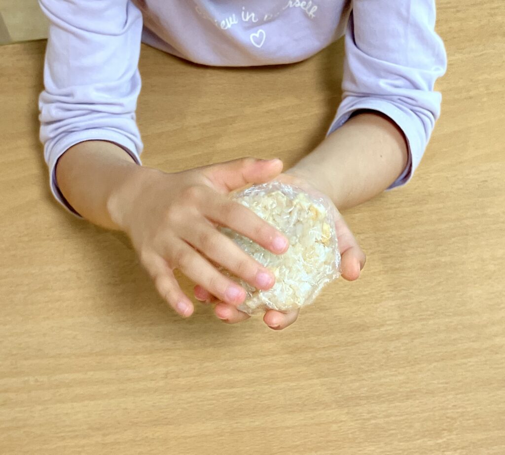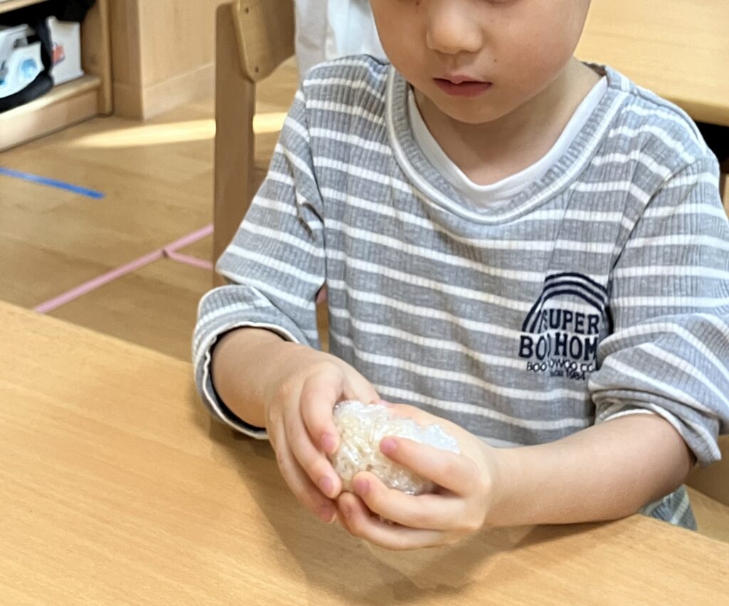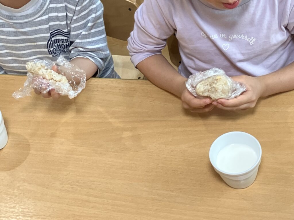 自分たちで洗ったお米が無事に炊け、おやつに具材を入れたおにぎりを握って食べました。自分たちで作ったおにぎりは特別美味しいね♪いつもよりも食べるスピードも早く完食です。