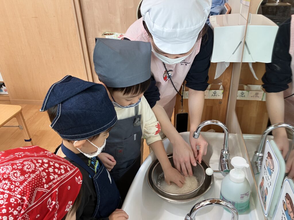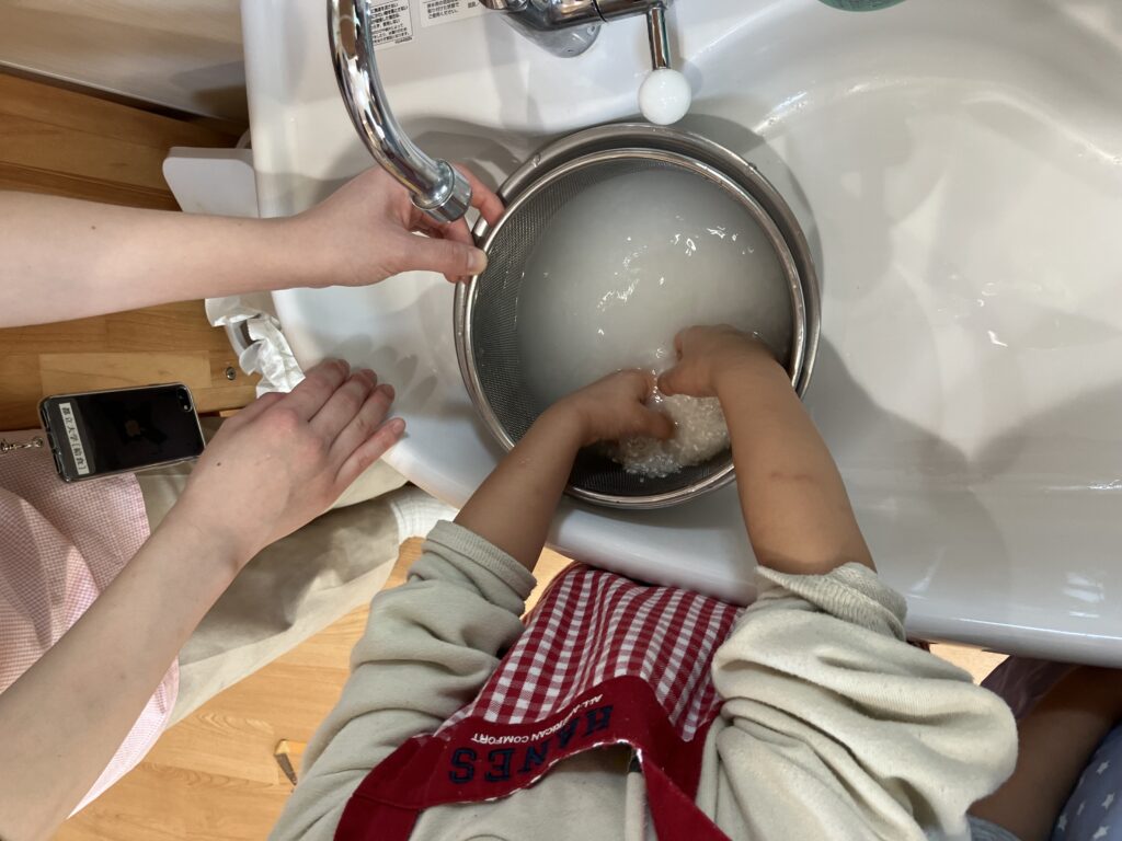 今度はお米とぎをやってみよう~!最初はお水の色が真っ白だけど透明になるまで洗うよ~お米を流さないように慎重にねと先生に教えてもらいながらお友だちと協力しながら洗います。洗い終わったら炊飯器に移してスイッチオン!!炊けるのが楽しみだね☆