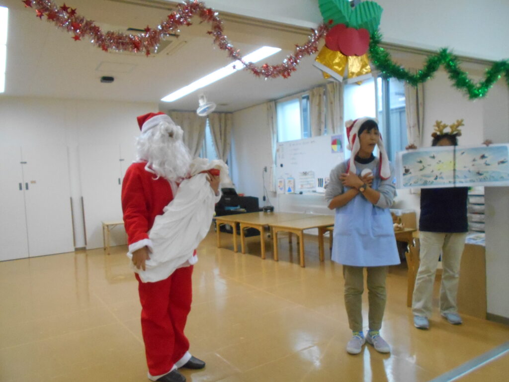 クリスマス会の雰囲気たっぷりの中楽しい会になりました。サンタさん、また来年ぜったいに来てね~(^^)