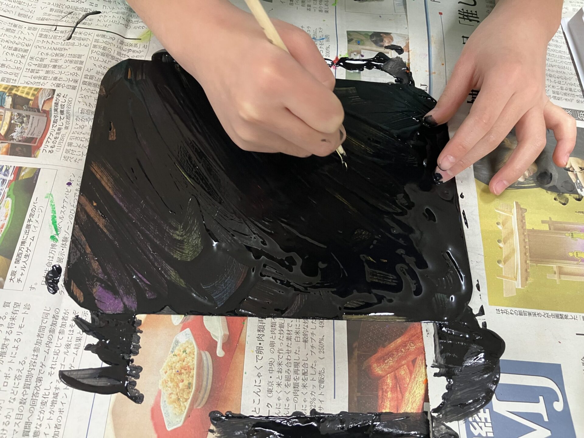 スクラッチアート専用の塗料を紙にのせローラーで伸ばしていきます。